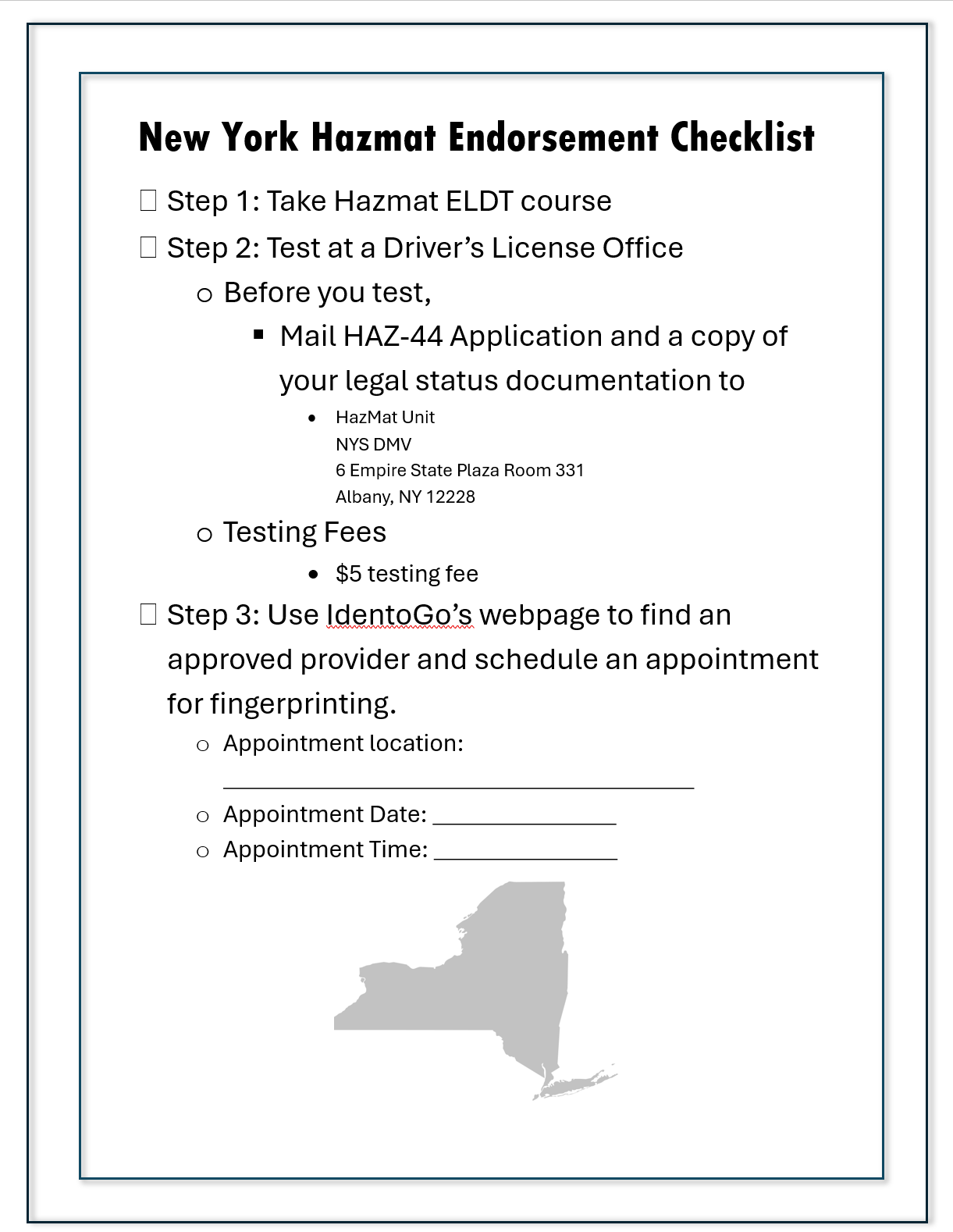 Anyone who hauls hazardous materials must have a CDL, regardless of vehicle size. Once you have your CDL, you must get your Hazmat Endorsement. There are four easy steps to get your Hazmat (H) Endorsement in New JYork: