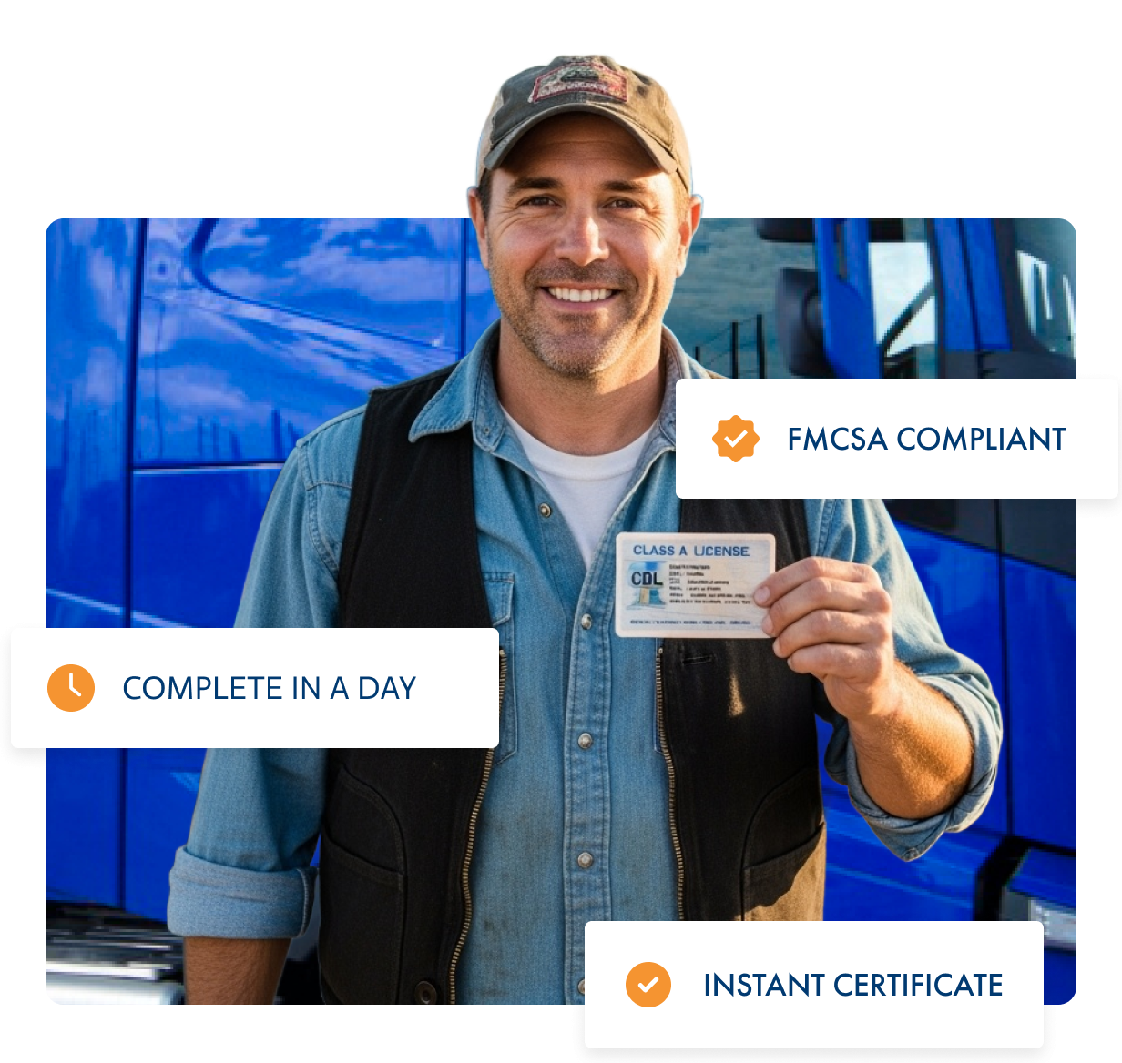 Take your FMCSA-approved ELDT course entirely online using your phone, tablet, or computer. You’ll get a certificate instantly after completion. We even guarantee acceptance by your behind-the-wheel school — or we’ll refund your payment, no questions asked.